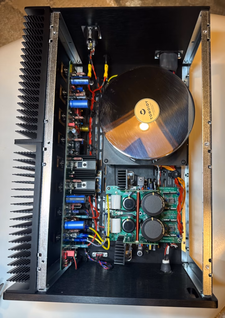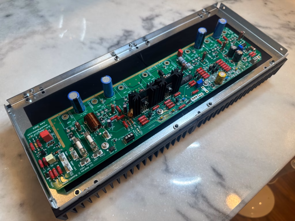 Here are some pictures of US-based builder Steven Edwards beautiful ax-Amplifier build. He elected to go with mono blocks and used the mono block housing from Modushop. Steven used a Torroidy power transformer and PSU and protection boards from other DIY suppliers on diyAudio.com.